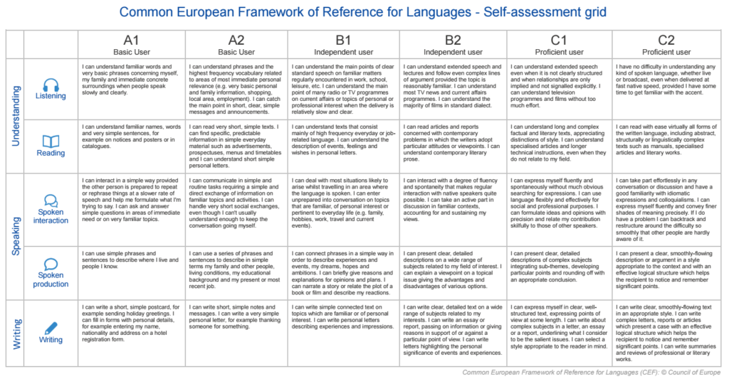 Please use the Common European Framework of Reference (CEFR) self-assessment grids below to estimate your current language level. You may then report this estimated level for the relevant foreign languages on your application. There are 6 levels according to this scale as described below A1, A2, B1, B2, C1, and C2.